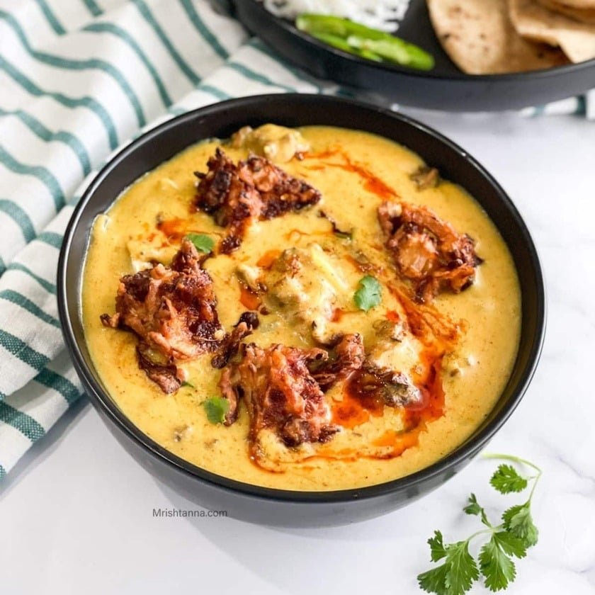 Our Kadhi Pakora is a beloved North Indian classic featuring crispy gram flour (besan) dumplings simmered in a luscious, tangy yogurt-based curry spiced with mustard seeds, curry leaves, and traditional Indian herbs.