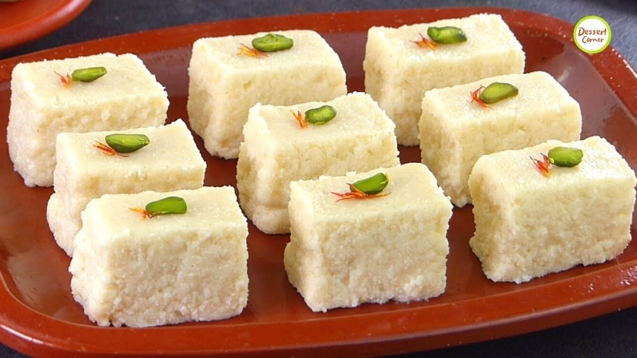 Barfi: A fudgy, bite-sized treat made from condensed milk and ghee, available in flavors like coconut, pistachio, almond, and more. Rich, creamy, and topped with edible silver leaf or chopped nuts for a festive finish.